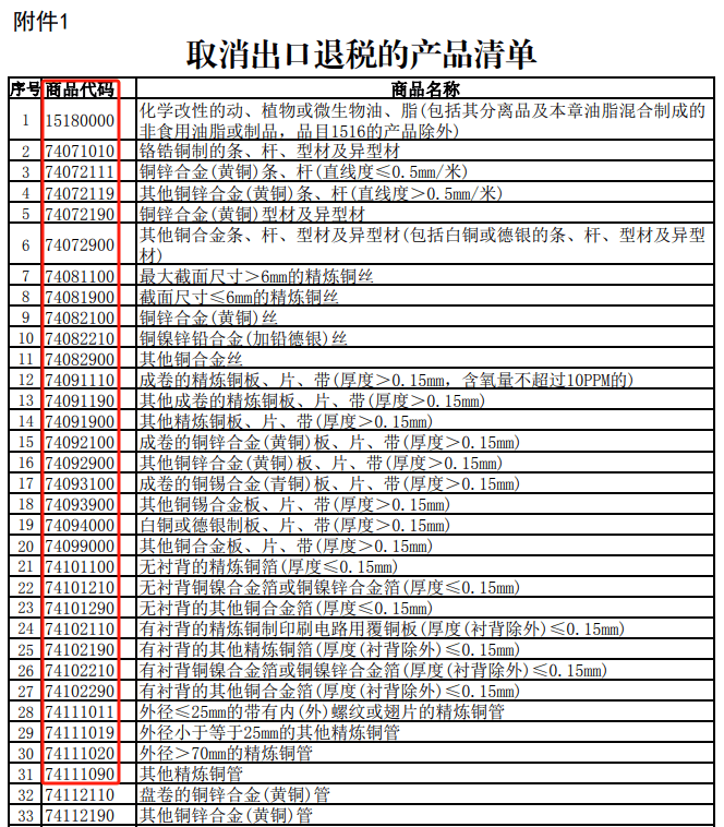 关于打消出口退税的产物清单,总共包含59个产物,除了通知布告提到的产物,好比精辟铜管、铜板,其他铜合金条等,根基都是金属材料一类。